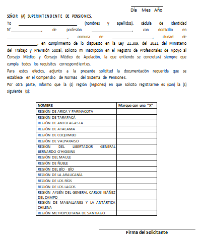 Libro III Beneficios Previsionales > Título I Pensiones > D.1 Beneficios por Enfermedad Terminal > Anexo N° 4 Solicitud de inscripción en el Registro Nacional de Profesionales de Apoyo al Consejo Médico y al Consejo Médico de Apelación