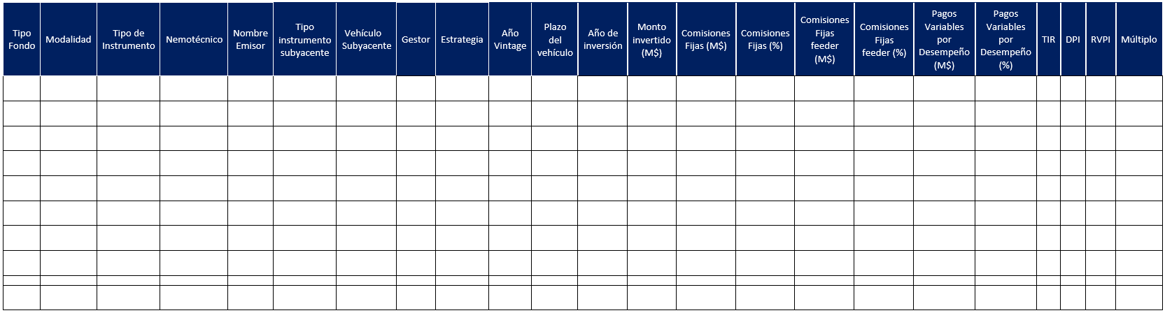 Se deberá informar el nombre establecido en el LPA o contrato correspondiente, que será el nombre del vehículo de inversión o empresa, según corresponda. Se debe informar una fila por cada uno de los vehículos alternativos u operación de coinversión subyacentes. Solo debe informarse en el caso de fondos de inversión nacionales.