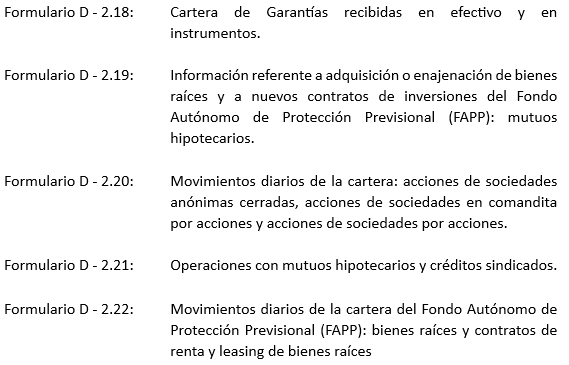 El informe diario está compuesto por un conjunto de datos codificados que deben ser proporcionados a la Superintendencia de Pensiones, a través de los siguientes formularios electrónicos, los que se adjuntan en el Anexo N° 1 de este Título: