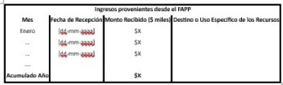 Se debe presentar el detalle de los ingresos efectivamente recibidos desde el Fondo Autónomo de Protección Previsional (FAPP) durante el trimestre informado y acumulado al cierre del ejercicio contable. La información se presenta desglosada por mes, indicando el monto, la fecha de recepción de los recursos y el uso o destino específico asignado a cada ingreso.