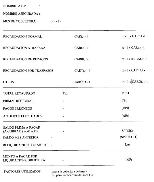 Libro V Aspectos Administrativos y Operacionales de las Administradoras de Fondos de Pensiones y del Instituto de Previsión Social > Título VII Contratación del Seguro de Invalidez y Sobrevivencia > B. Información que las Administradoras deben proporcionar a la Superintendencia de Pensiones y a las Compañías de Seguros de Vida, respecto del Seguro de Invalidez y Sobrevivencia que cubre los Siniestros de Invalidez o Muerte de Afiliados al Sistema de Pensiones del D.L Nº 3.500 > Anexos > Anexo Nº 3 Informe de recaudación y pago de prima