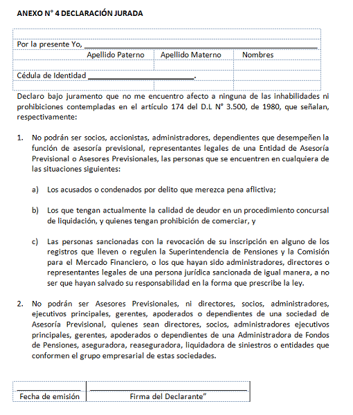Libro V Aspectos Administrativos y Operacionales de las Administradoras de Fondos de Pensiones y del Instituto de Previsión Social > Título VIII Asesoría Previsional > A. De las Asesorías Previsionales > Anexos > Anexo N° 4 Declaración Jurada