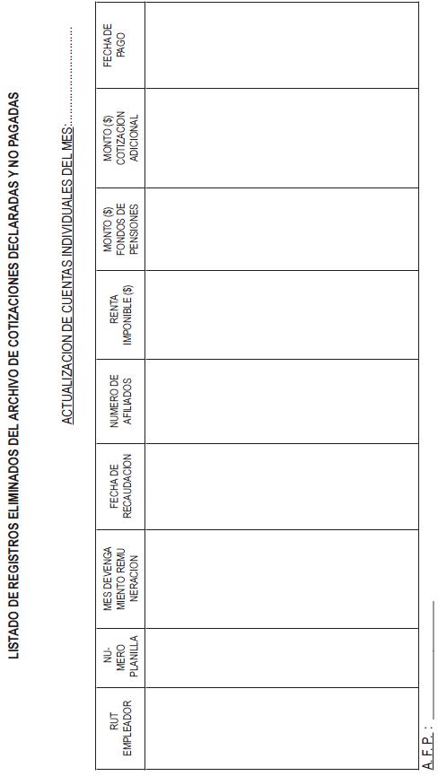 Libro II Cotizaciones Previsionales > Título VIII Pago de las cotizaciones > C. Declaración y no pago de cotizaciones y Registros que deberán mantener las Administradoras > Anexos > Anexo Nº 1 Listado de registros eliminados del Archivo de cotizaciones declaradas y no pagadas