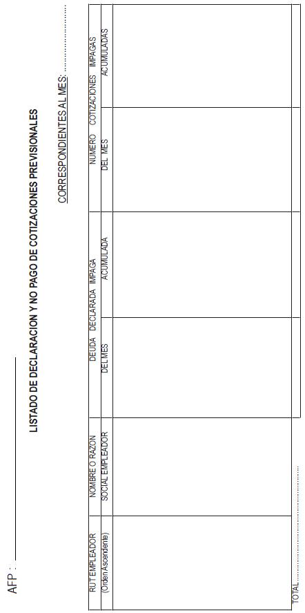 Libro II Cotizaciones Previsionales > Título VIII Pago de las cotizaciones > C. Declaración y no pago de cotizaciones y Registros que deberán mantener las Administradoras > Anexos > Anexo Nº 2 Listado de declaración y no pago de cotizaciones previsionales