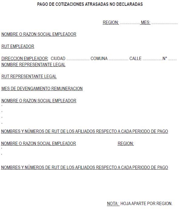 Libro II Cotizaciones Previsionales > Título VIII Pago de las cotizaciones > C. Declaración y no pago de cotizaciones y Registros que deberán mantener las Administradoras > Anexos > Anexo Nº 3 Pago de cotizaciones atrasadas no declaradas