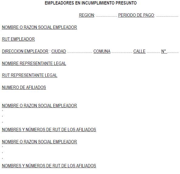 Libro II Cotizaciones Previsionales > Título VIII Pago de las cotizaciones > C. Declaración y no pago de cotizaciones y Registros que deberán mantener las Administradoras > Anexos > Anexo Nº 4 Empleadores en incumplimiento presunto