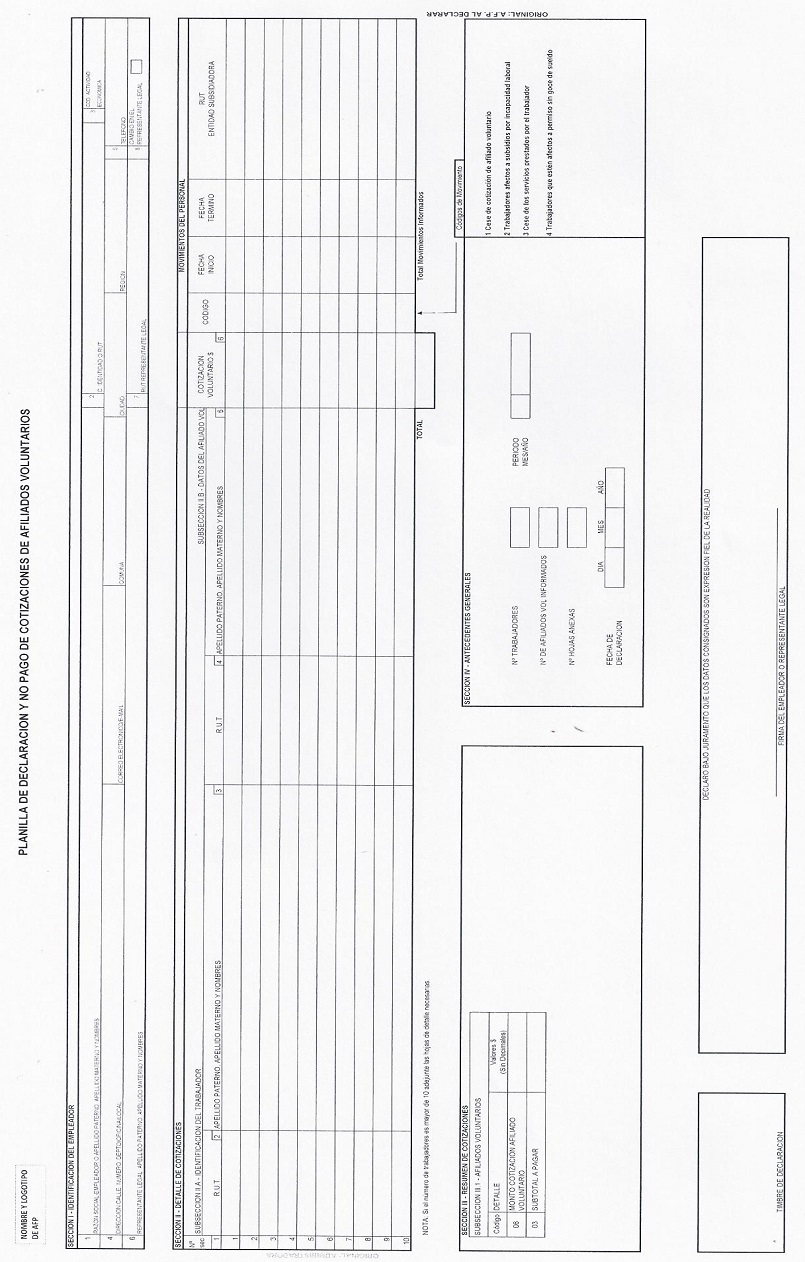 a) "PLANILLA DE DECLARACIÓN Y NO PAGO DE COTIZACIONES DE AFILIADOS VOLUNTARIOS" que corresponde al original del set de planillas y que sirve para declarar las cotizaciones de afiliados voluntario.