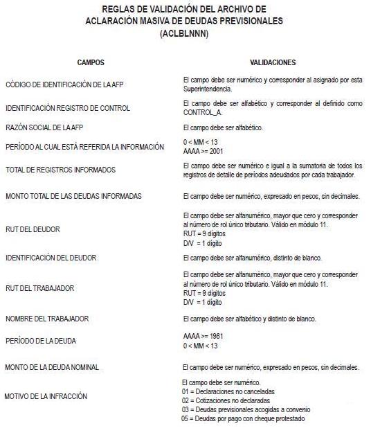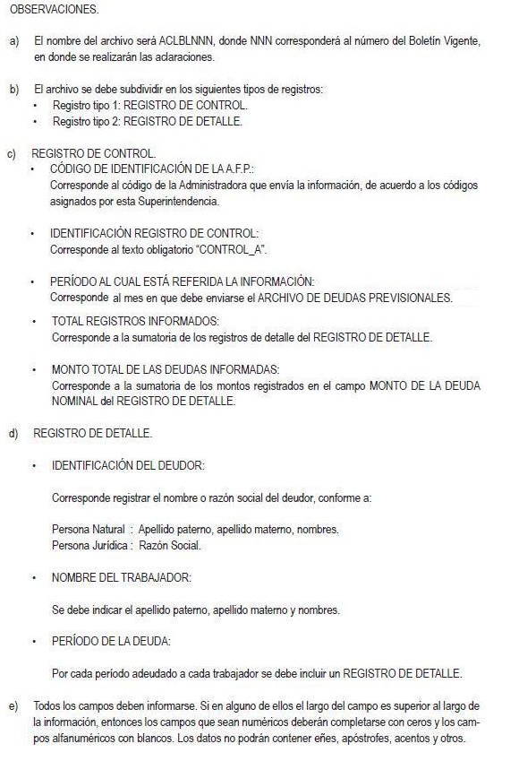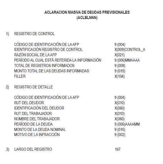 Libro II Cotizaciones Previsionales > Título X Información de empleadores que deben proporcionar las AFP > A. Información de empleadores morosos para efectos del Boletín de Infractores a la Legislación Laboral y Previsional > Anexos > Anexo Nº 2 Aclaración masiva de deudas previsionales