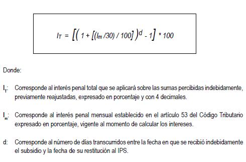 3. Además, a las sumas de dinero percibidas indebidamente reajustadas de acuerdo a lo señalado en el número anterior se les aplicará un interés penal en base al interés penal mensual establecido en el artículo 53 del Código Tributario, vigente en la fecha en que se restituyen los recursos, por todo el período transcurrido entre la fecha en que se recibió indebidamente el subsidio y la fecha de su restitución al IPS.