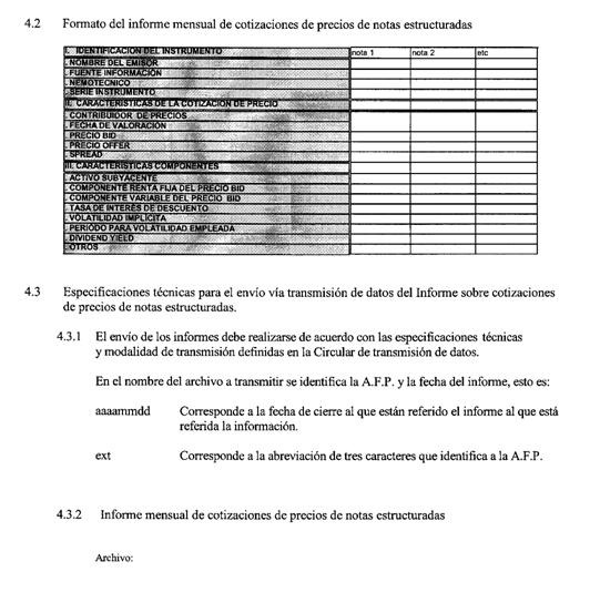 Libro IV Fondos de Pensiones y Regulación de Conflictos de Intereses > Título II Inversión de los Fondos de Pensiones en el extranjero > D. Norma de Información > Anexos > Anexo Nº 4 Informe Mensual de Cotizaciones de Precios de Notas Estructuradas