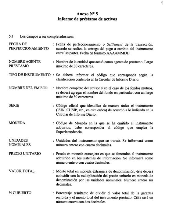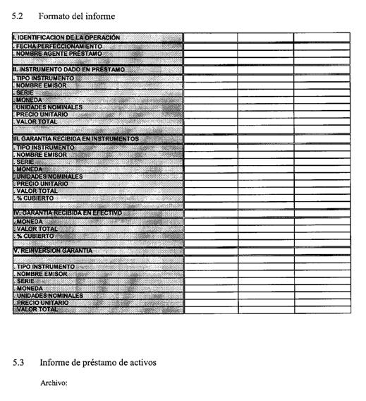 Libro IV Fondos de Pensiones y Regulación de Conflictos de Intereses > Título II Inversión de los Fondos de Pensiones en el extranjero > D. Norma de Información > Anexos > Anexo Nº 5 Informe de Préstamo de Activos