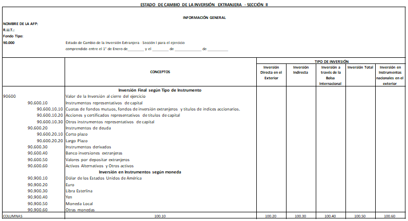 Libro IV Fondos de Pensiones y Regulación de Conflictos de Intereses > Título II Inversión de los Fondos de Pensiones en el extranjero > E. Estado de Cambio de la Inversión Extranjera de los Fondos de Pensiones > Anexos > Anexo Formato de Estado de cambio de Inversión en Instrumentos Extranjeros