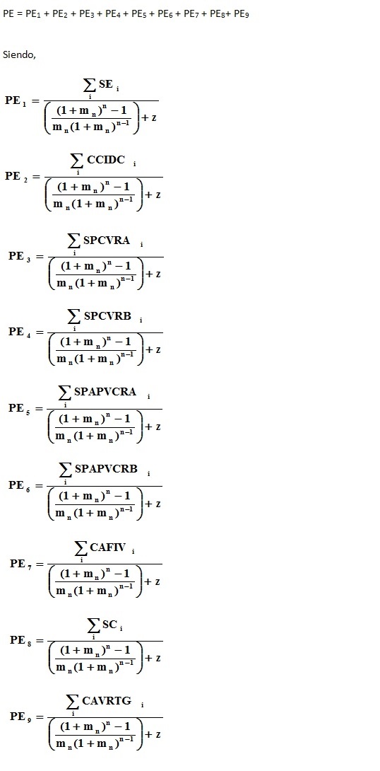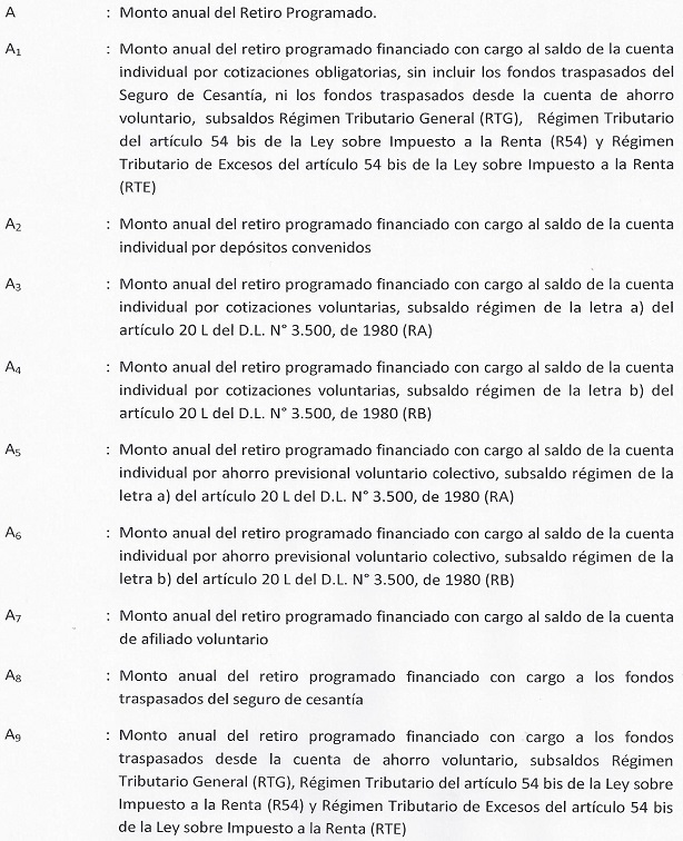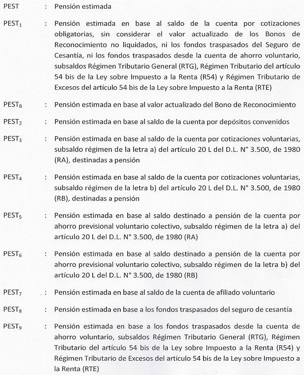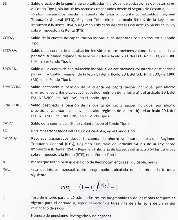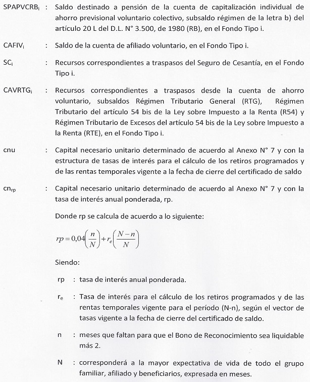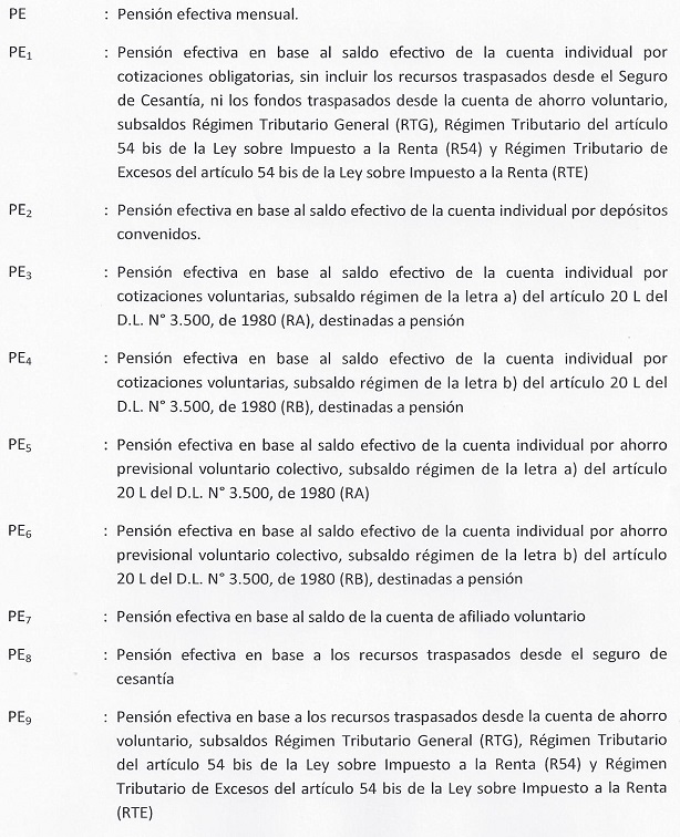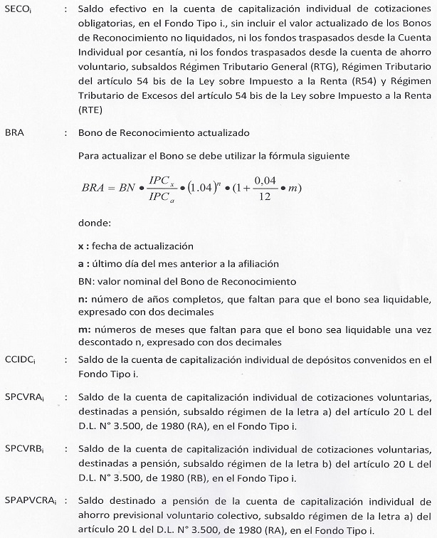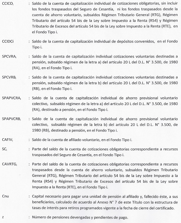 La anualidad se determinará como la suma de las anualidades generadas por los diferentes registros de las cuentas personales, cuenta de capitalización individual de cotizaciones obligatorias incluida la bonificación por hijo para mujeres cuando corresponda (CCICO), distinguiendo aquellos fondos traspasados del Seguro de Cesantía (SC) y desde la cuenta de ahorro voluntario (CAVRTG) de los restantes; cuenta de capitalización individual de depósitos convenidos (CCIDC); saldo destinado a pensión de la cuenta de capitalización individual de cotizaciones voluntarias (SPCVRA y SPCVRB); saldo destinado a pensión de la cuenta de capitalización individual de ahorro previsional voluntario colectivo (SPAPVCRA y SPAPVCRB) y cuenta de afiliado voluntario (CAFIV).