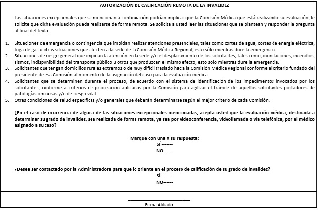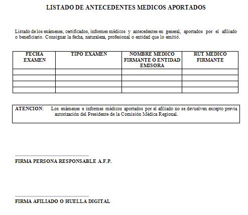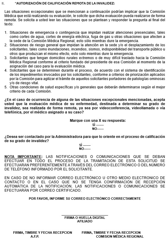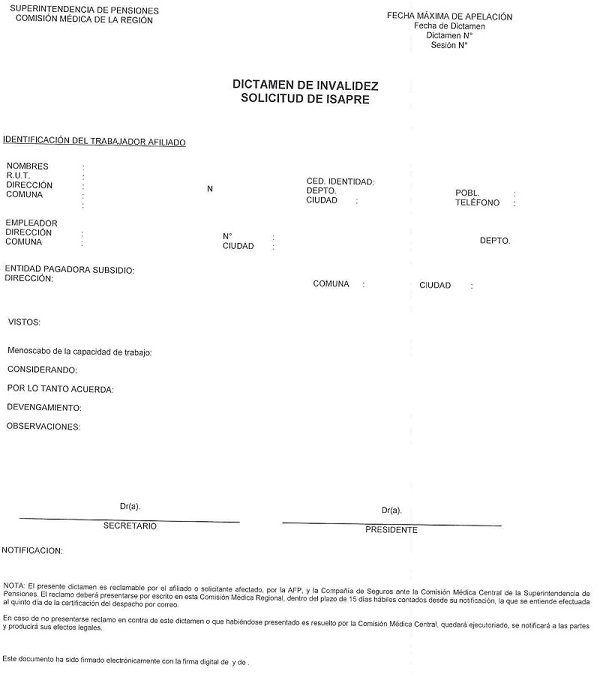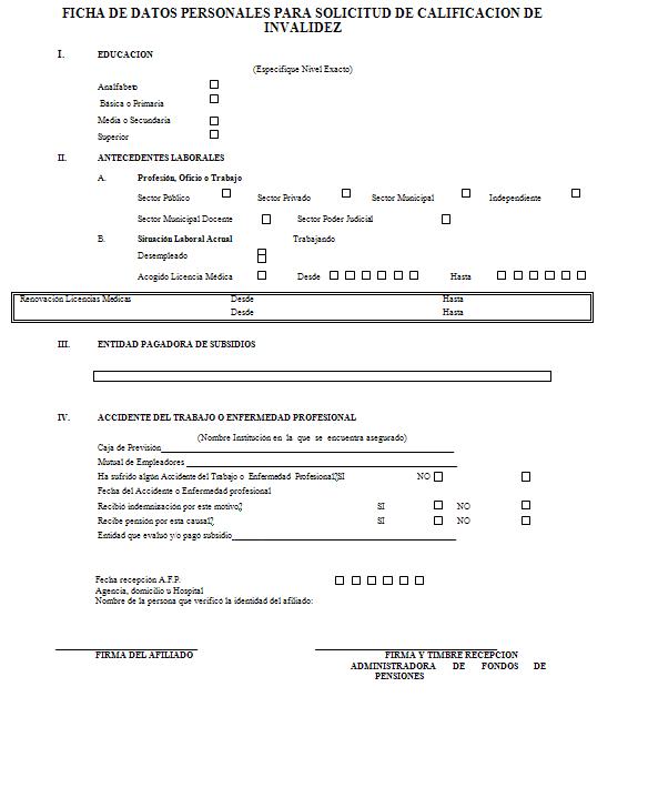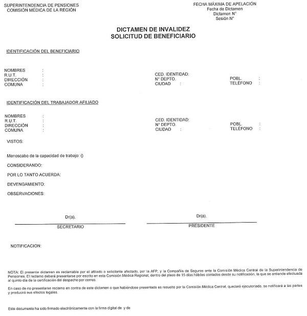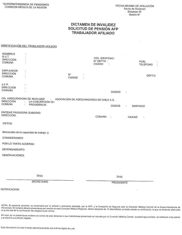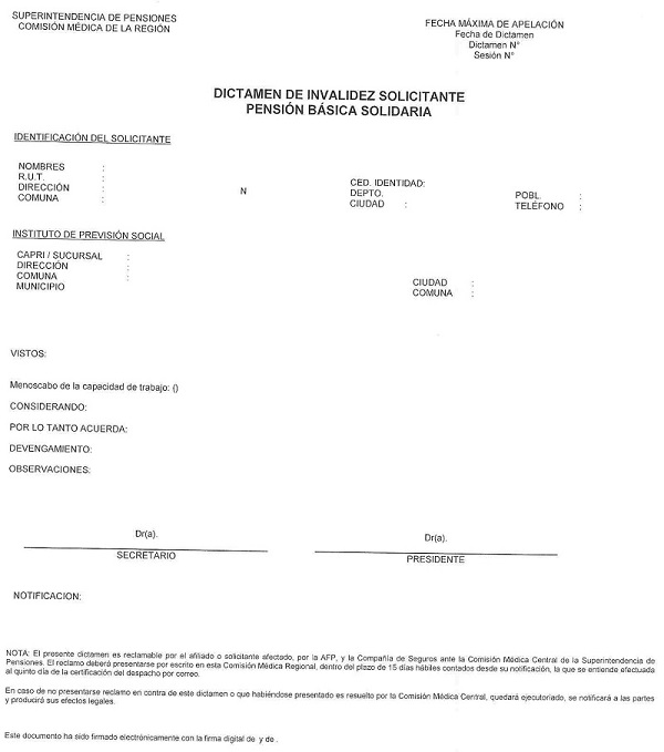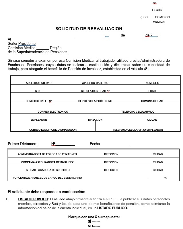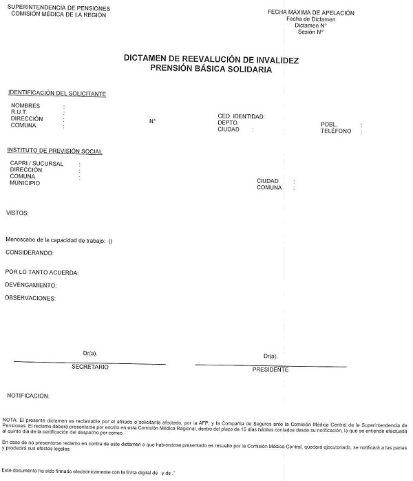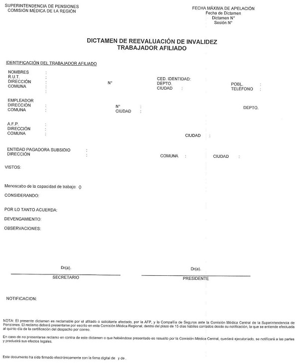 Nota de actualización: La Norma de Carácter General Nº 27, de fecha 7 de noviembre de 2011, reemplazó el Dictamen de Invalidez - Trabajador Afiliado, el Dictamen de Invalidez -Beneficiario de Pensión de Sobrevivencia, el Dictamen Modificatorio y el Dictamen de Reevaluación. Posteriormente, los formularios de Dictamen de Invalidez fueron reemplazados por la Norma de Carácter General N° 86, de fecha 27 de junio del 2013. A su vez, la la Norma de Carácter General N° 329, de fecha 13 de diciembre de 2024, modificó la Solicitud Reevaluación.