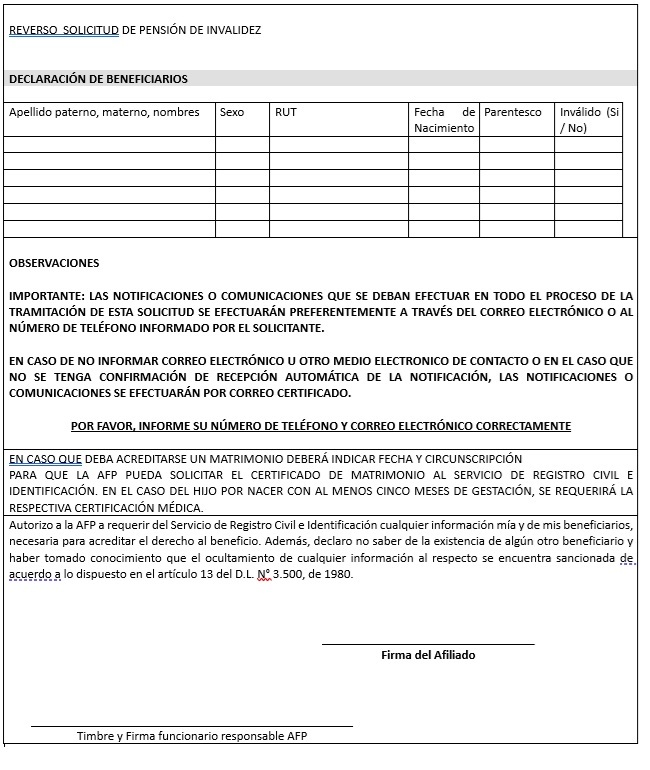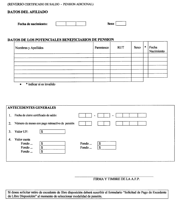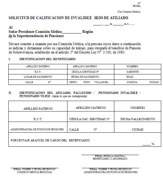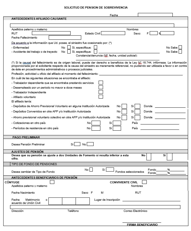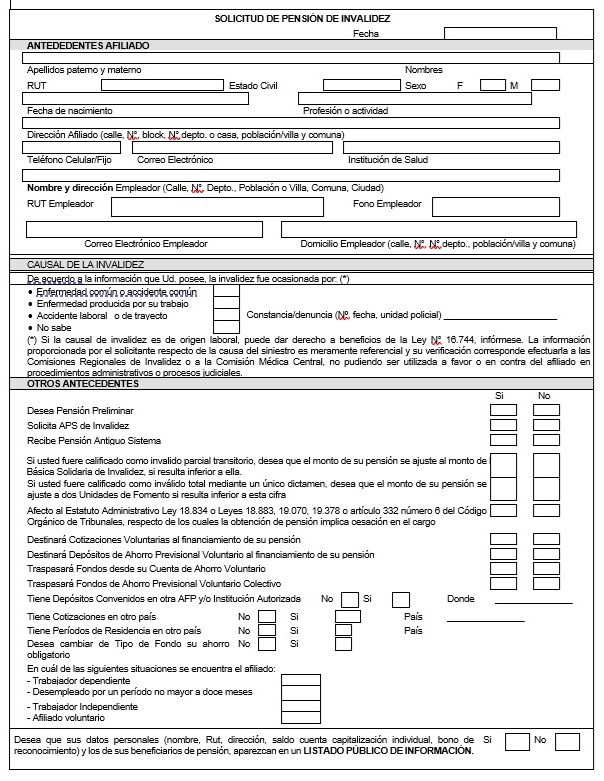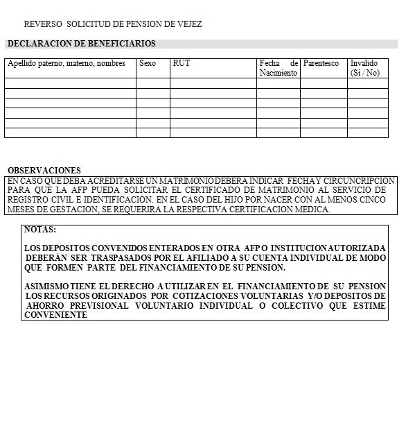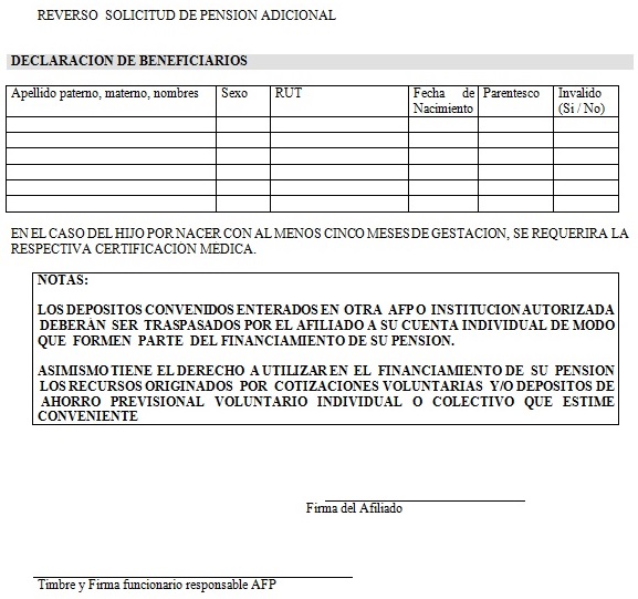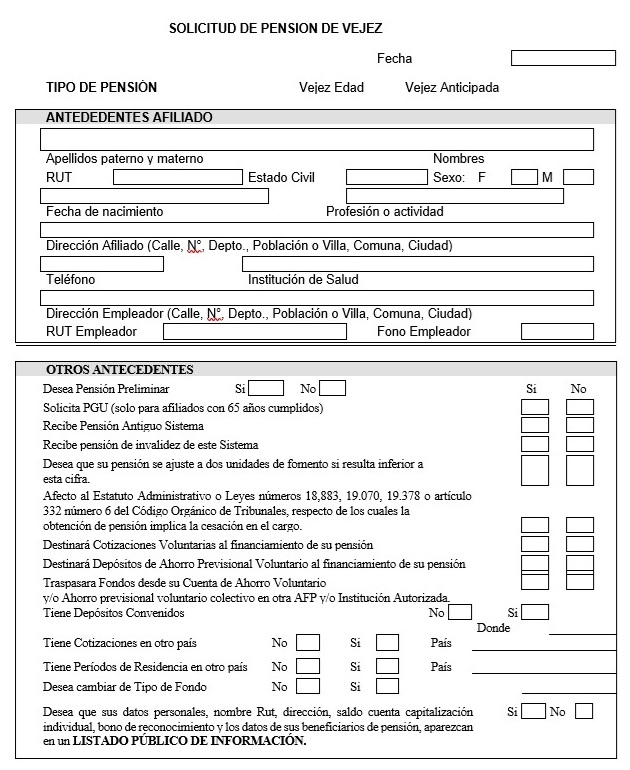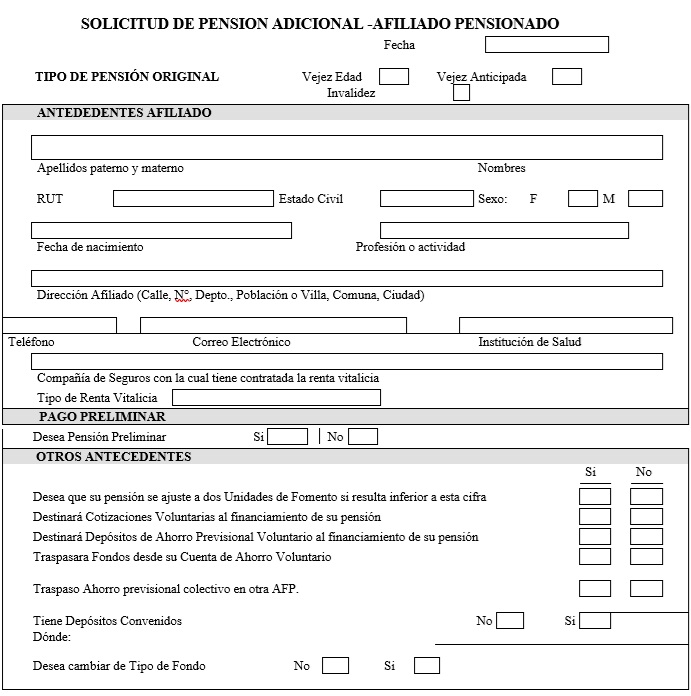 Nota de actualización: La Norma de Carácter General Nº 27, de fecha 7 de noviembre de 2011, reemplazó la Solicitud de Pensión de Vejez, la Solicitud de Pensión de Invalidez y la Solicitud de Pensión Adicional -Afiliado Pensionado. Posteriormente, la Norma de Carácter General N° 153, de fecha 11 de septiembre de 2015, modificó la solicitud de pensión de sobrevivencia. A su vez, la la Norma de Carácter General N° 329, de fecha 13 de diciembre de 2024, modificó la Solicitud de Pensión de Invalidez.