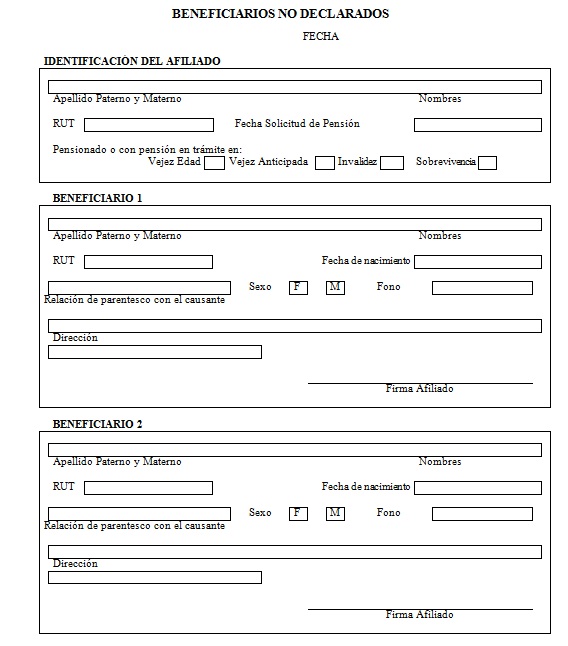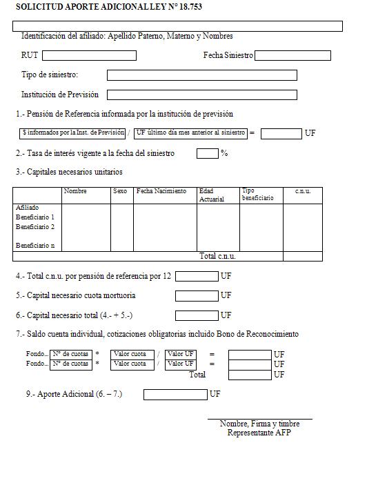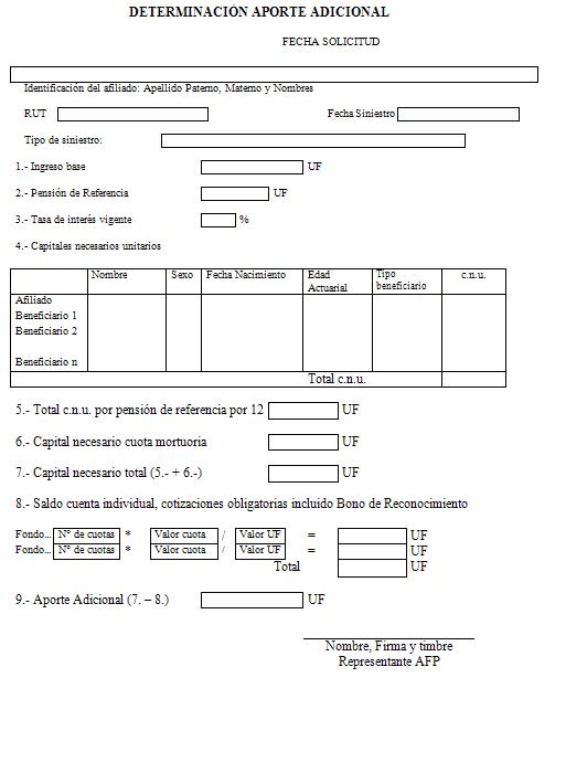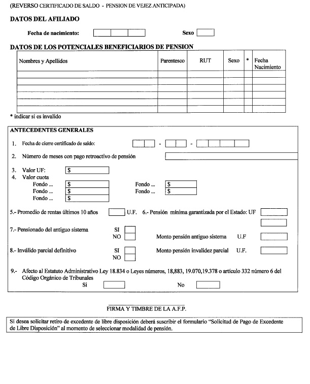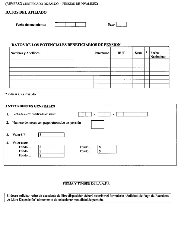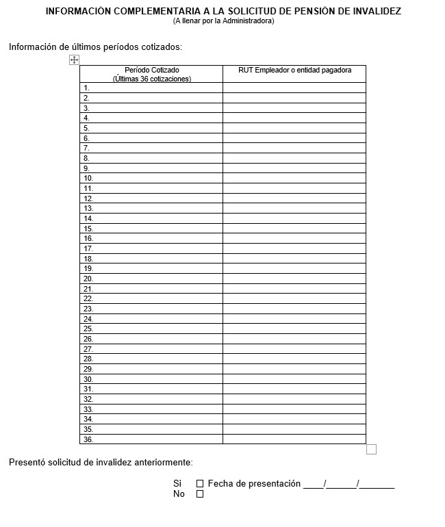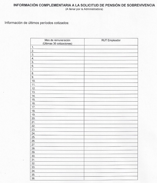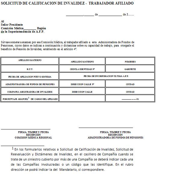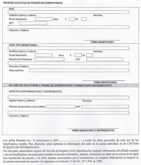 Nota de actualización: La Norma de Carácter General Nº 27, de fecha 7 de noviembre de 2011, reemplazó la Solicitud de Pensión de Vejez, la Solicitud de Pensión de Invalidez y la Solicitud de Pensión Adicional -Afiliado Pensionado. Posteriormente, la Norma de Carácter General N° 153, de fecha 11 de septiembre de 2015, modificó la solicitud de pensión de sobrevivencia. A su vez, la la Norma de Carácter General N° 329, de fecha 13 de diciembre de 2024, modificó la Solicitud de Pensión de Invalidez.