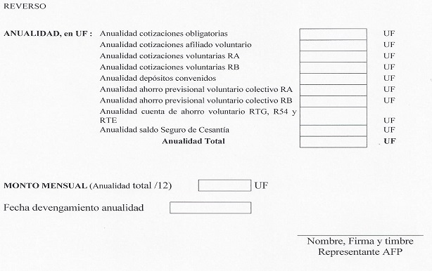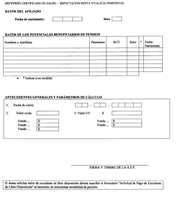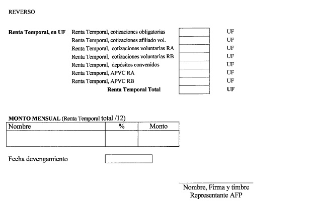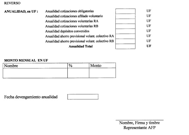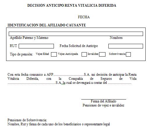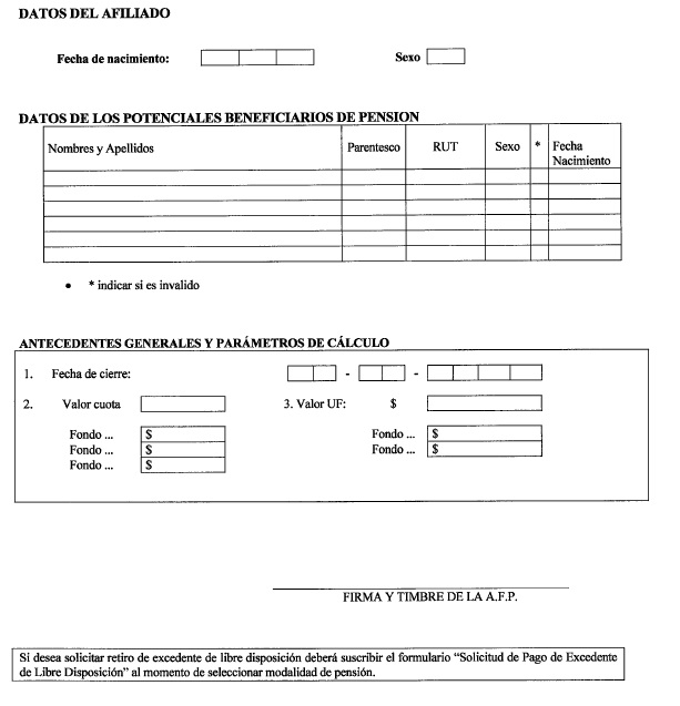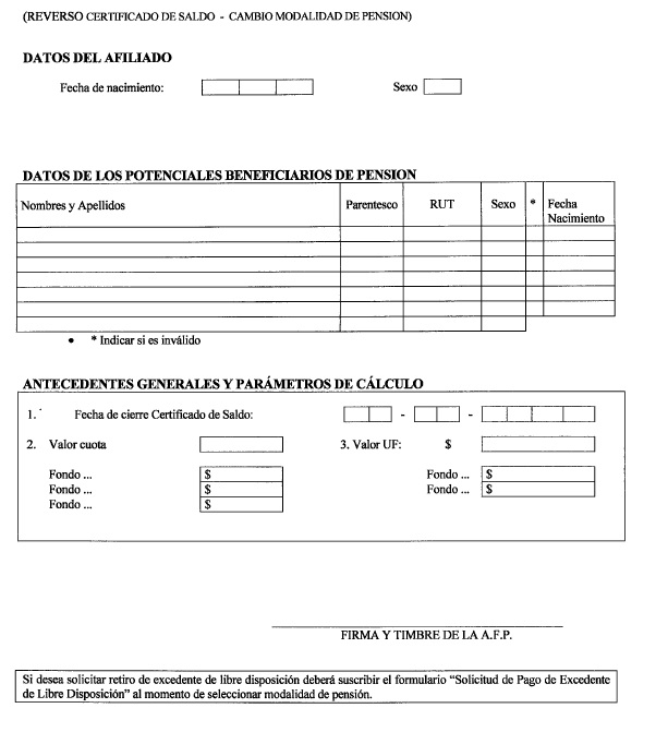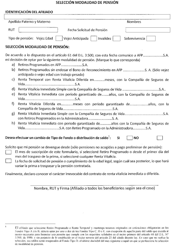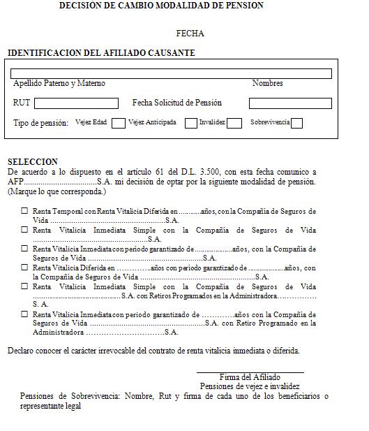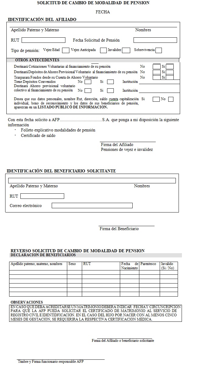 Nota de actualización: La Norma de Carácter General Nº 27, de fecha 7 de noviembre de 2011, reemplazó el formulario Solicitud de Cambio de Modalidad de Pensión. La Norma de Carácter General N° 112, de fecha 15 de mayo de 2014, reeemplazó el formulario Selección Modalidad de Pensión.