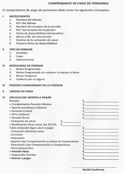 Nota de actualización: Este Comprobante de Pago de Pensiones fue modificado por la Norma de Carácter General Nº 23, de fecha 07 de octubre de 2011. Posteriormente fue reemplazado por la Norma de Carácter General N° 119, de fecha 11 de julio de 2014. Posteriormente, este Comprobante de Pago fue reemplazado por la Norma de Carácter General N° 193, de fecha 23 de enero de 2017.