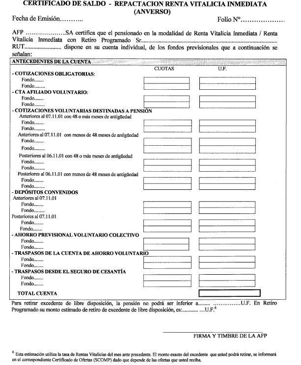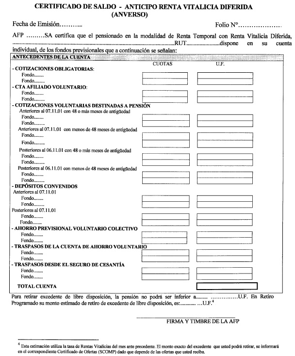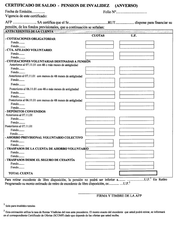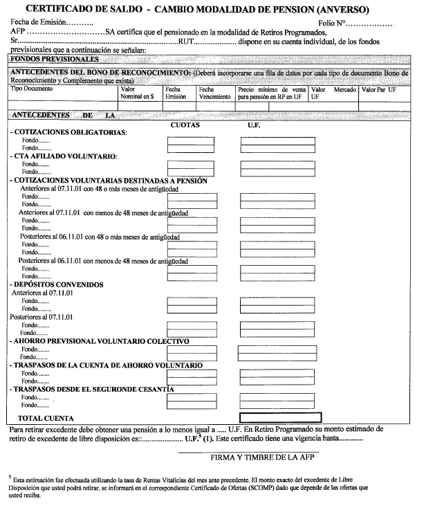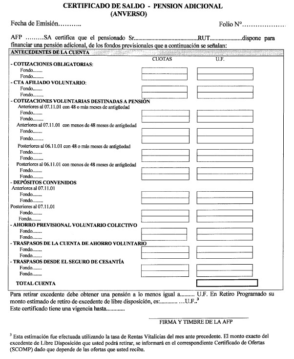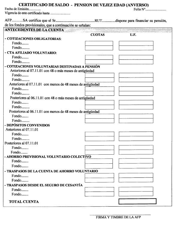 Además, el referido certificado de saldo deberá informar los saldos de las cuentas personales nocionales en los mismos términos definidos para las cuentas personales (en pesos, en cuotas del respectivo Fondo de Pensiones y en unidades de Fomento, según corresponda).
