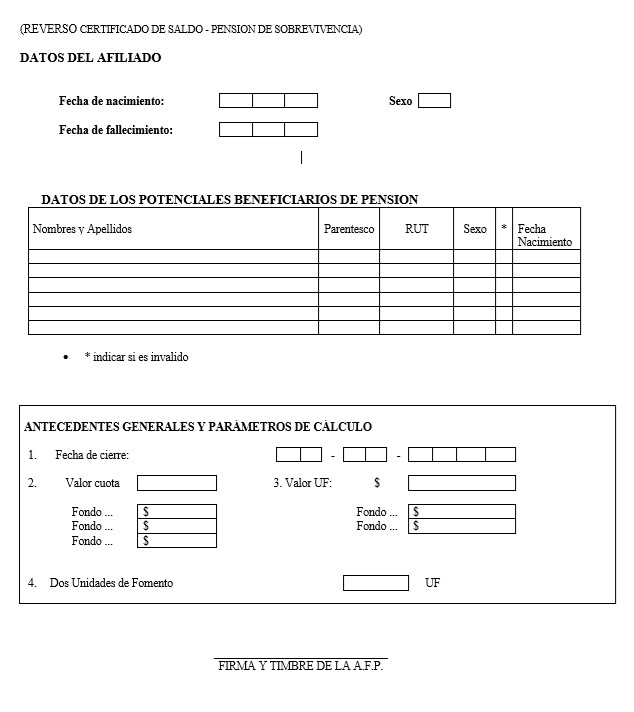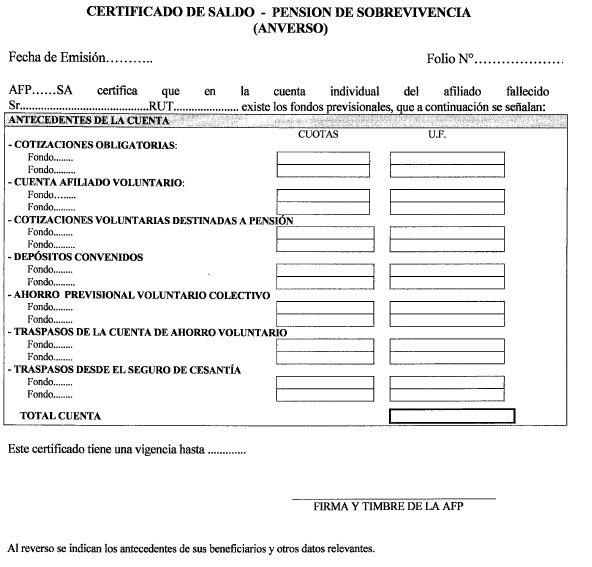 El certificado de saldo que se deba emitir para una pensión de sobrevivencia, originada al fallecimiento de un afiliado pensionado beneficiario del Sistema de Pensiones Solidarias que haya financiado el beneficio solidario con el saldo de su cuenta de capitalización individual, deberá incluir, a continuación de la firma y timbre de la AFP, la siguiente nota: