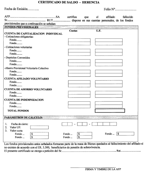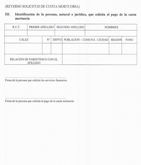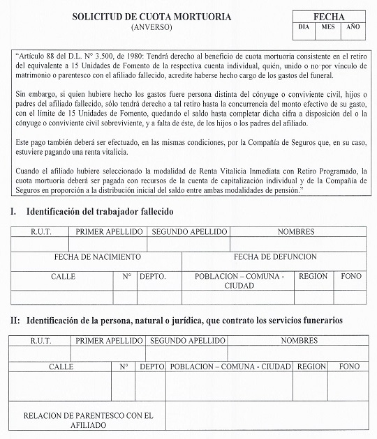 Nota de actualización: El formulario Solicitud de cuota mortuoria fue modificado por la Norma de Carácter General N° 153, de fecha 11 de septiembre de 2015. Posteriormente, este formulario fue reemplazado por la Norma de Carácter General N° 251, de fecha 9 de diciembre de 2019.
