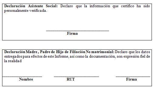 2. Debe ser suscrito por un(a) Asistente Social, el o la cual deberá registrar en el Informe, su nombre completo, N° RUT, empleador, dirección y teléfono, declarando además en él, que la información que certifica ha sido personalmente verificada.