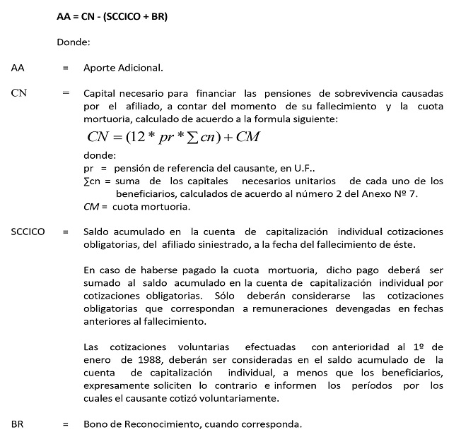La acreditación de la calidad de potenciales beneficiarios debe efectuarse de acuerdo a lo dispuesto en la letra a) del número 2 del Anexo Nº 2, es decir solo se debe acreditar edad, sexo, relación de parentesco y condición de invalidez. En esta instancia no se deberá exigir el cumplimiento de otros requisitos como por ejemplo, ser estudiante, tener un cierto periodo de tiempo de matrimonio, vivir a expensas, etc., ya que estos se deben cumplir al momento del fallecimiento del afiliado. En consecuencia para efectos de determinar el monto del aporte adicional en el cálculo del capital necesario deben ser considerados todos los potenciales beneficiarios para resguardar las pensiones de sobrevivencia que se deriven.