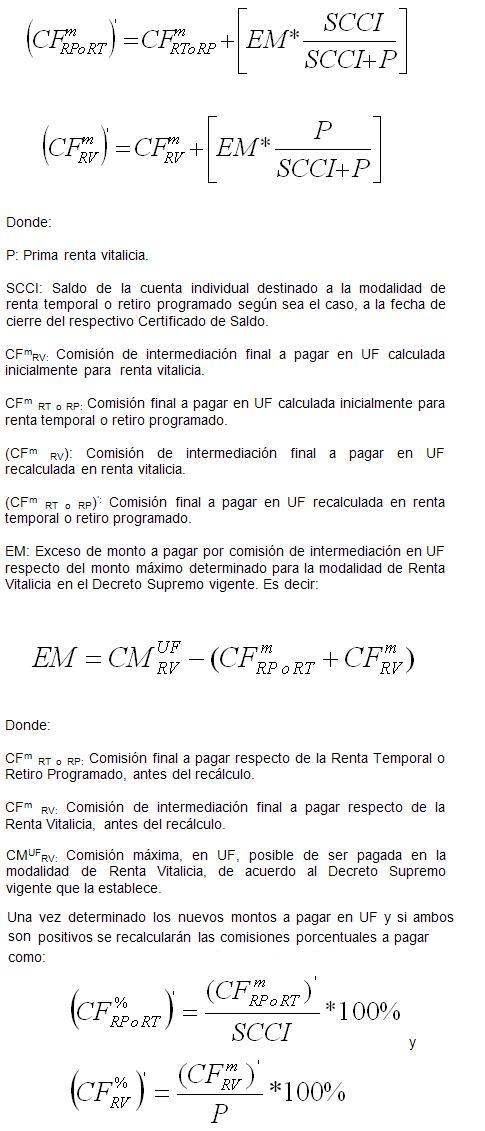 Si aplicada la comisión máxima al saldo destinado a la Renta Temporal o al Retiro Programado y/o si aplicada la comisión máxima al saldo destinado a Renta Vitalicia se obtiene para cada uno o ambos casos un monto en UF superior al establecido en el Decreto Supremo vigente, éstos se ajustarán a los montos máximos permitidos, según corresponda y si su suma en UF no supera el máximo permitido, se determinarán las comisiones (%) equivalentes a dichos montos.