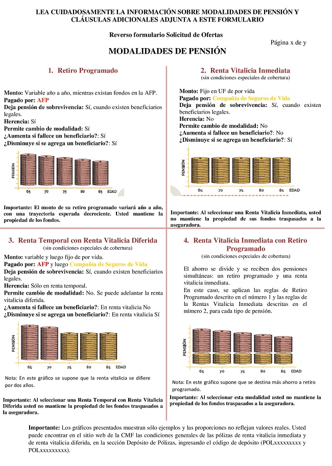 20. Al final de la primera página del formulario deberá incluirse, en mayúsculas de un tamaño de al menos 0,5 cms., la siguiente leyenda: "LEA CUIDADOSAMENTE LA INFORMACIÓN SOBRE MODALIDADES DE PENSIÓN Y CLÁUSULAS ADICIONALES ADJUNTA A ESTE FORMULARIO."