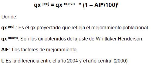 Con el fin de capturar la disminución en la tasa de mortalidad, desde el año central de la tabla hasta el año 2004, se aplico un factor de mejoramiento sobre la base de las proyecciones del CELADE a nivel poblacional. Estas proyecciones fueron implementadas en la tabla de acuerdo a la siguiente formula: