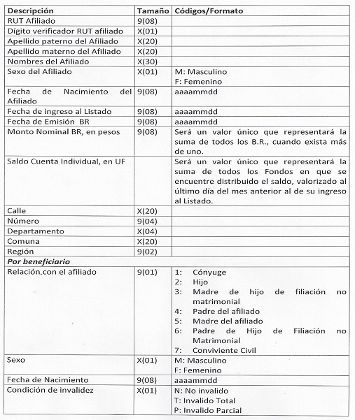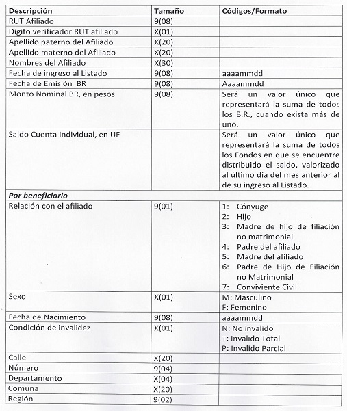 Libro III Beneficios Previsionales > Título XI Instrucciones para emitir listado público de potenciales pensionados y solicitantes de pensión, Artículo 72 bis del D.L. N° 3.500, de 1980 > Anexos > Anexo Nº 2 Datos del listado