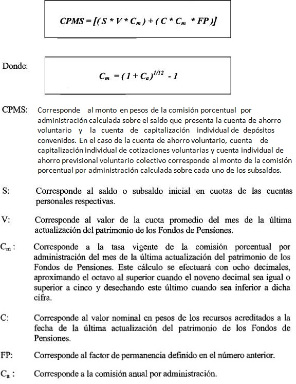 16. Para efectos de determinar el monto en pesos de la comisión porcentual por administración, las Administradoras de Fondos de Pensiones deben aplicar la siguiente fórmula: