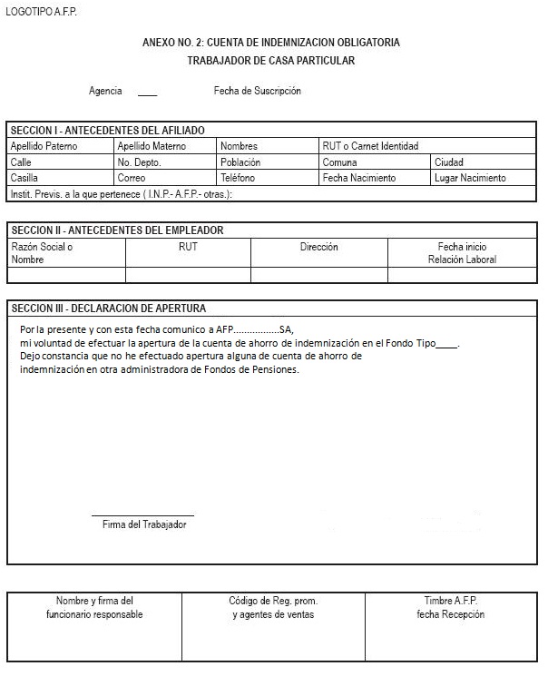 Libro I Afiliación al Sistema de Pensiones del D.L. N° 3.500 de 1980 > Título V Cuenta de Ahorro de Indemnización > Anexos > Anexo Nº 2 Cuenta de Indemnización Obligatoria: Trabajador de casa particular