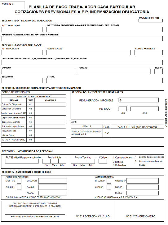 Para todos aquellos trabajadores de casa particular que sean afiliados al antiguo régimen previsional, su empleador sólo pagará en esta planilla los aportes de indemnización obligatoria (1,11 %), por lo tanto deberán abstenerse de completar los siguientes recuadros de la SECCIÓN III: Cotización Obligatoria, cotización voluntaria, depósito de ahorro y Depósito convenido.