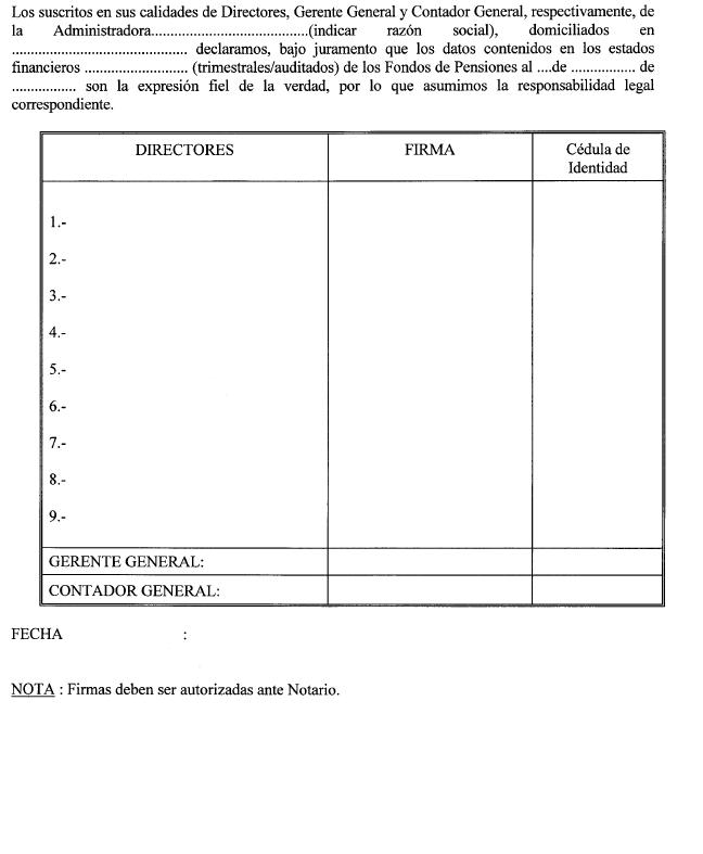 Libro IV Fondos de Pensiones y Regulación de Conflictos de Intereses > Título VII Contabilidad de los Fondos de Pensiones y de las Administradoras de Fondos de Pensiones > C. Informes Financieros de los Fondos de Pensiones: Presentación > Anexos > Anexo Nº 2 Declaración de Responsabilidad sobre los Eestados Financieros (trimestrales/auditados) de los Fondos de Pensiones