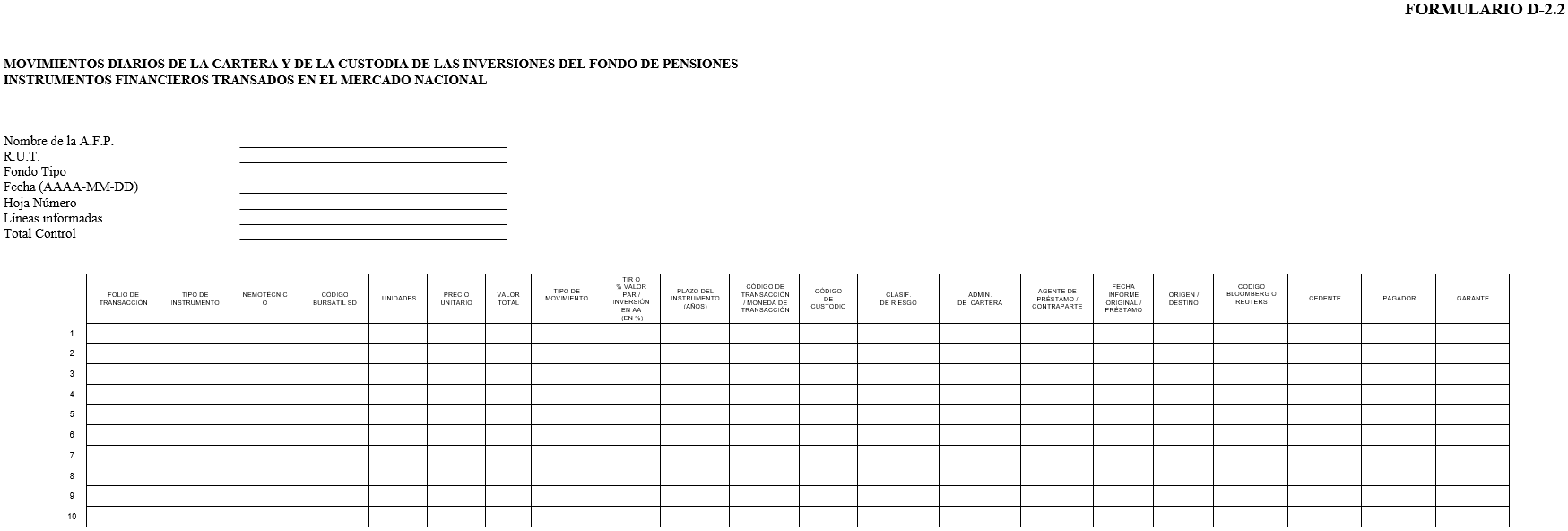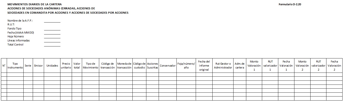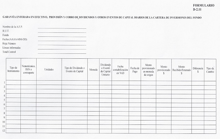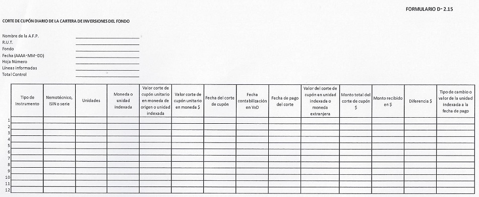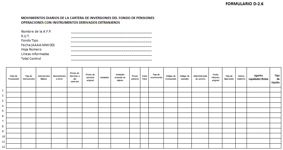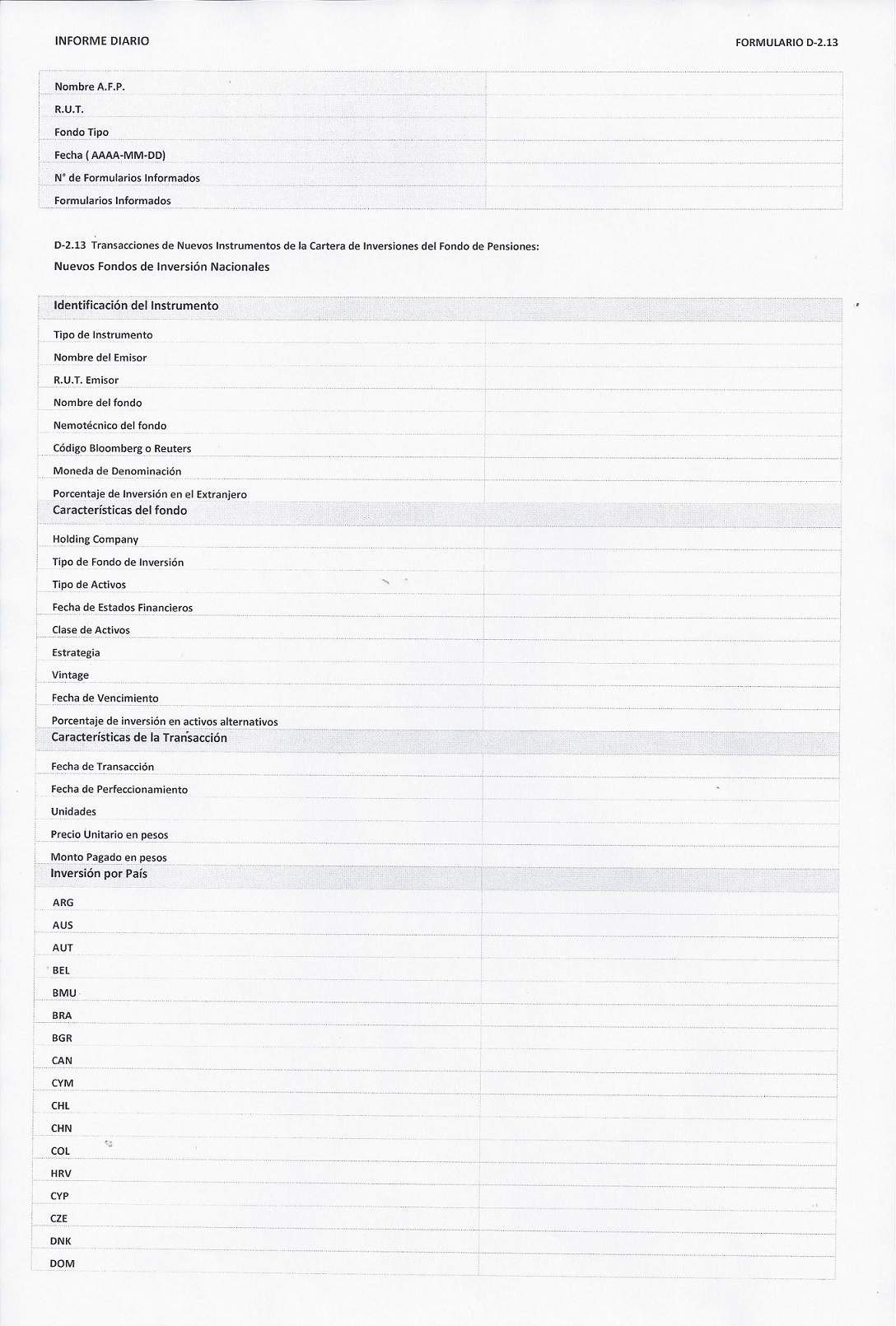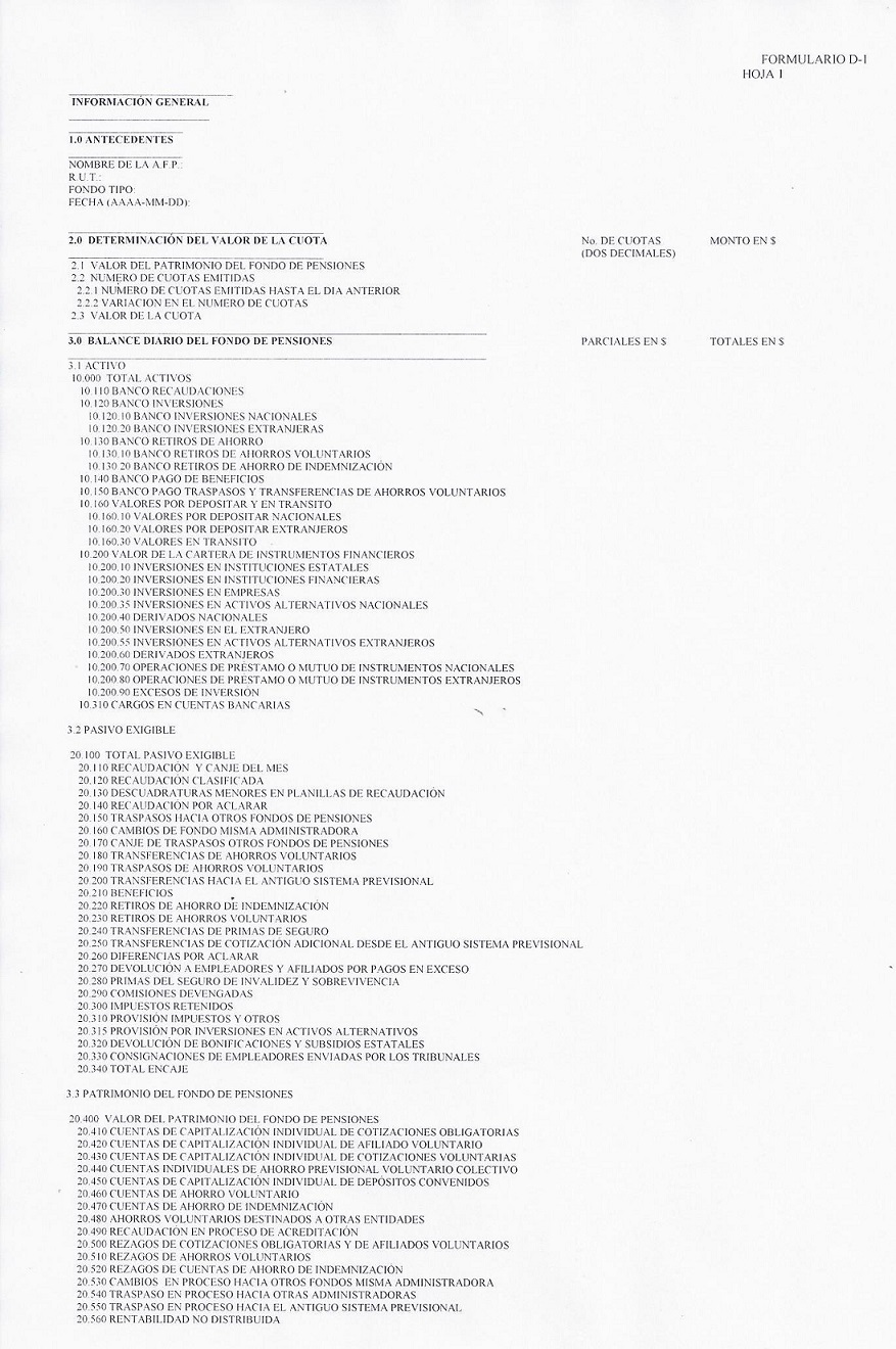 Libro IV Fondos de Pensiones y Regulación de Conflictos de Intereses > Título VIII Informes Diarios que deben presentar las Administradoras de Fondos de Pensiones > Anexos > Anexo Nº 1 Formularios del Informe Diario