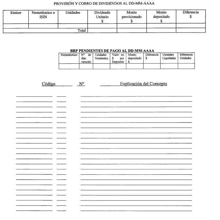 Nota de actualización: Este anexo fue modificado por la Norma de Carácter General Nº 14, de fecha 30 de junio de 2011. Posteriormente este anexo fue modificado por las Normas de Carácter General Nº 7, de fecha 3 de junio de 2011 y Nº 98, de fecha 16 de diciembre de 2013. Posteriormente este anexo modificado por la Norma de Carácter General Nº 138, de fecha 11 de marzo de 2015. Posteriormente, este anexo fue modificado por la Norma de Carácter General N° 195, de fecha 16 de febrero de 2017. Posteriormente, este anexo fue modificado por la Norma de Carácter General N° 208, de fecha 25 de octubre de 2017. Posteriormente, este anexo fue modificado por la Norma de Carácter General Nº 242, de fecha 16 de mayo de 2019. Posteriormente, este anexo fue modificado por la Norma de Carácter General Nº 256, de fecha 27 de diciembre de 2019. Posteriormente, fue modificado por por la Norma de Carácter General Nº 300, de fecha 30 de junio de 2022.
