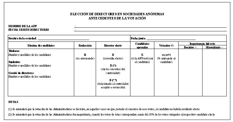 Libro IV Fondos de Pensiones y Regulación de Conflictos de Intereses > Título IX Directores y Juntas de Accionistas, Juntas de Tenedores de Bonos y Asambleas de Aportantes de Fondos de Inversión > A. Asistencia y Participación en Juntas de Accionistas, Juntas de Tenedores de Bonos y Asambleas de Aportantes de Fondos de Inversión en Representación de los Fondos de Pensiones > Anexos > Anexo Nº 2 Elección de Directores en Sociedades Anónimas, antecedentes de la votación