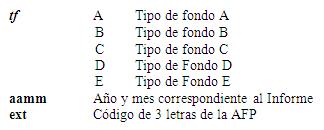 En cada archivo (uno por cada tipo de Fondo) se debe incluir 5 registros por cada una de las A.F.P. existentes, ordenadas alfabéticamente por nombre y a continuación 5 registros de totales por tipo de Fondo. La agrupación de 5 registros por cada A.F.P., corresponde a los tipos de Fondos existentes, ordenados alfabéticamente por tipo de Fondo.