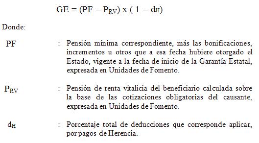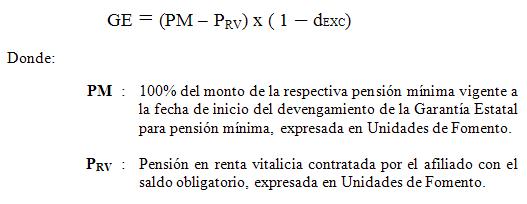 El monto de la Garantía Estatal para ese mes y los siguientes, será la diferencia entre la correspondiente pensión mínima vigente y la pensión devengada y se otorgará hasta que esta pensión llegue a ser igual o superior a la respectiva pensión mínima, o hasta la extinción del derecho del o los beneficiarios.