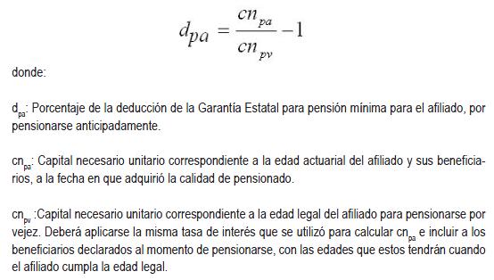 c) Las personas que se pensionaron antes de cumplir la edad legal tendrán derecho a la Garantía Estatal para pensión mínima una vez cumplida la edad legal. El monto de la Garantía Estatal será aquel que resulte de aplicar, a la diferencia entre la respectiva pensión mínima vigente y la renta contratada con el saldo obligatorio, una deducción por pensionarse anticipadamente (dPA), que se calculará de acuerdo a la siguiente fórmula: