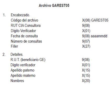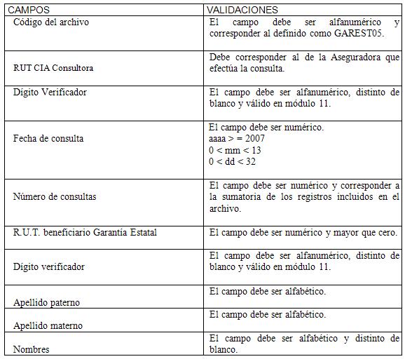 1. El proceso de actualización del cumplimiento de los requisitos para la Garantía Estatal, consistirá en el intercambio de información entre la Aseguradora que consulta ("CIA Consultora") y las restantes Aseguradoras ("CIA Consultada(s)"). Este intercambio se efectuará mediante dos archivos denominados "GAREST05" y "GAREST06", de consulta y respuesta, respectivamente.