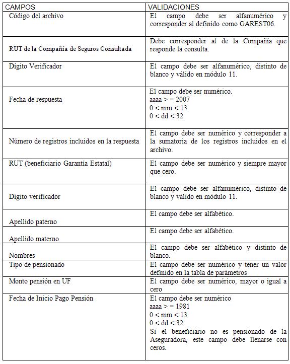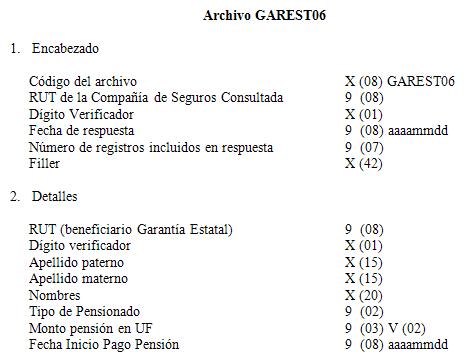 3. La transferencia de las respuestas deberá efectuarse dentro de los 10 primeros días del mes siguiente al que se recepcionó la consulta. Para efectuar la Consulta de Calidad de Pensionado, se podrán utilizar los siguientes archivos, cuya descripción de registros se detalla a continuación. No obstante, las Aseguradoras podrán convenir entre ellas otras formas y medios, en cuyo caso las características técnicas deberán ser informadas a la Superintendencia de Pensiones en forma previa a su aplicación.
