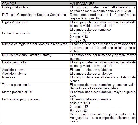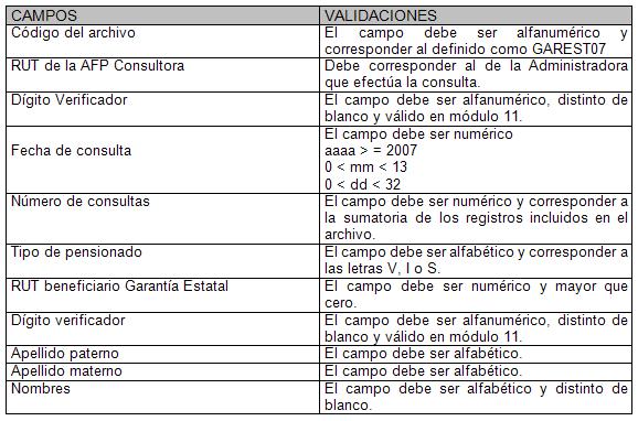 Para efectuar la Consulta de Calidad de Pensionado, se podrán utilizar los siguientes archivos, cuya descripción de registros se detalla a continuación. No obstante, las Administradoras si acuerdan aplicar otras formas y medios con las Aseguradoras, las características técnicas deberán ser informadas a la Superintendencia de Pensiones en forma oportuna.