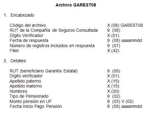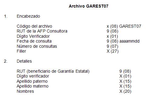 1. El proceso de verificación del cumplimiento de los requisitos para la Garantía Estatal, consistirá en el intercambio de información entre la Administradora que consulta ("AFP Consultora") y las Aseguradoras ("CIA Consultada(s)"). Este intercambio se efectuará mediante dos archivos denominados "GAREST07" y "GAREST08", de consulta y respuesta, respectivamente.