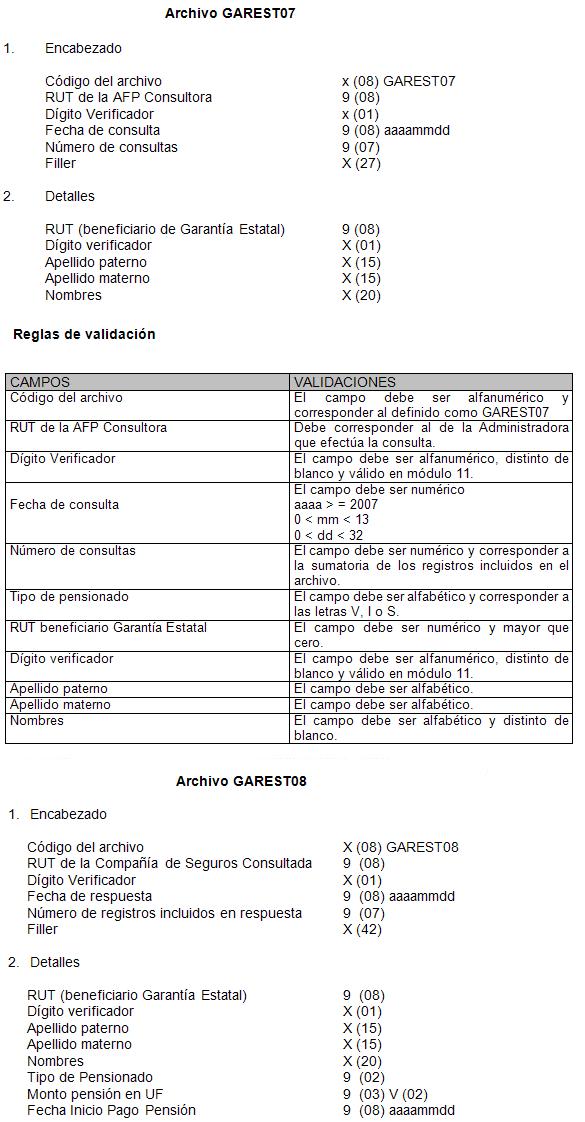 1. El proceso de verificación del cumplimiento de los requisitos para la Garantía Estatal, consistirá en el intercambio de información entre la Administradora que consulta ("AFP Consultora") y las Aseguradoras ("CIA Consultada(s)"). Este intercambio se efectuará mediante dos archivos denominados "GAREST07" y "GAREST08", de consulta y respuesta, respectivamente.