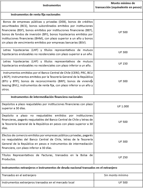 Nota de actualización: Esta tabla fue reemplazada por la Norma de Carácter General Nº 138, de fecha 11 de marzo de 2015. Posteriormente, la Norma de Carácter General Nº 156, de fecha 2 de octubre de 2015, eliminó la original letra c), pasando la actual letra d) a ser c). Posteriormente, esta tabla fue modificada por la Norma de Caracter General N° 205, de fecha 25 de Octubre de 2017. Posteriormente, esta tabla fue modificada por la Norma de Caracter General N° 294, de fecha 18 de Febrero de 2022. Posteriormente, esta tabla fue modificada por la Norma de Carácter General Nº 322, de fecha 11 de junio de 2024.