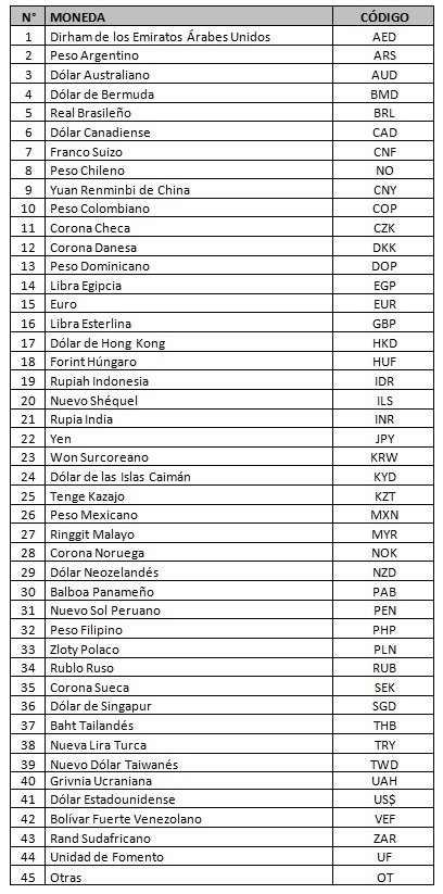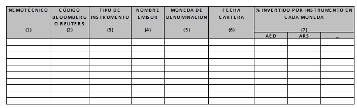Las cifras corresponderán a números enteros con dos decimales. En la sección 1.5 se adjunta nómina con el nombre y código de cada moneda que debe ser informada. No se deberá informar las monedas sin inversión y la suma total debe ser igual a 100. La columna "OT" deberá emplearse en caso de no aplicar ninguna de las monedas listadas.