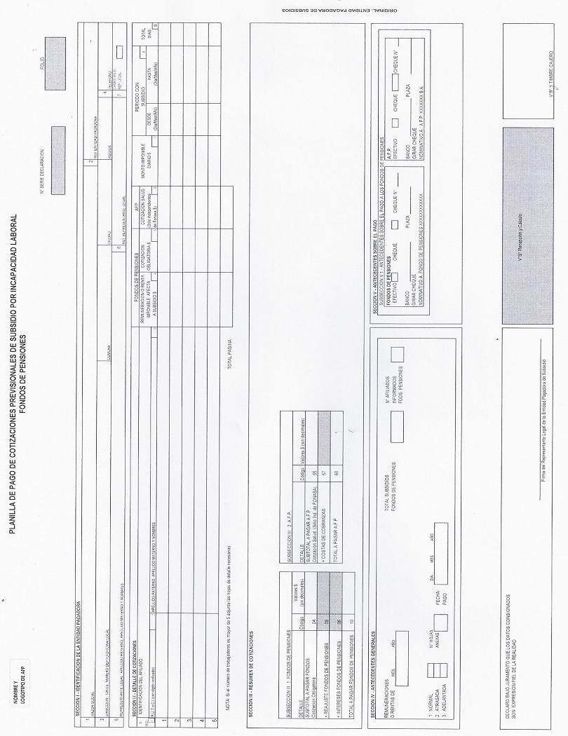 EL REPRESENTANTE LEGAL DE LA ENTIDAD PAGADORA DEBERA FIRMAR LA PLANILLA DE PAGO DE COTIZACIONES PREVISIONALES DE SUBSIDIO POR INCAPACIDAD LABORAL FONDOS DE PENSIONES Y SEGURO DE CESANTIA.
