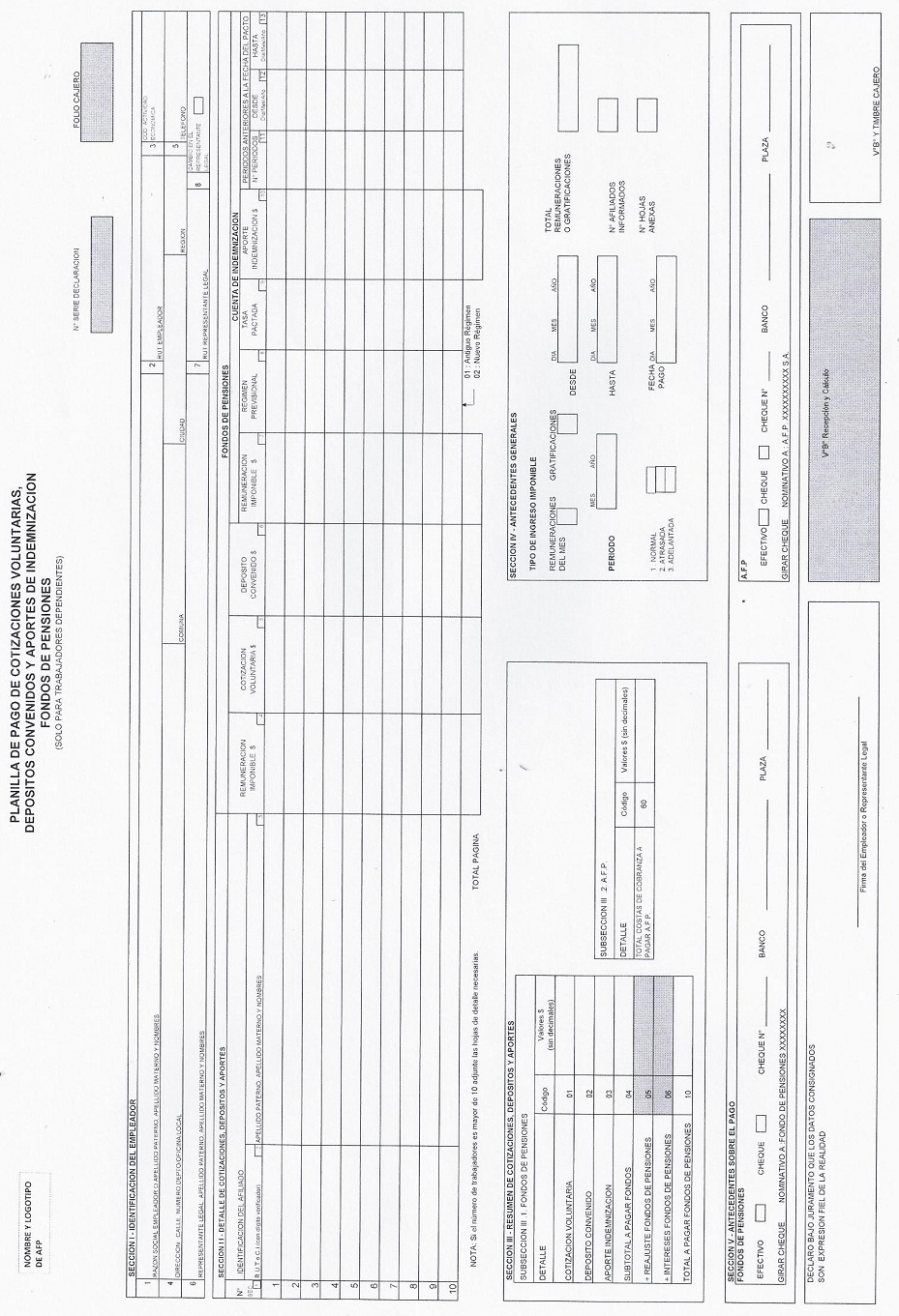 EL EMPLEADOR O REPRESENTANTE LEGAL DEBERA FIRMAR LA PLANILLA DE PAGO DE COTIZACIONES VOLUNTARIAS, DEPOSITOS CONVENIDOS Y APORTES DE INDEMNIZACION FONDOS DE PENSIONES.